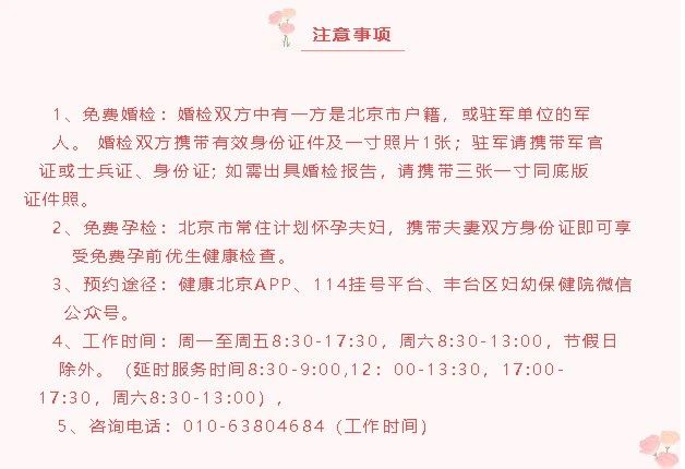 婚孕检专区拥有一支优秀敬业的专业服务团队,环境温馨,设施一流。专区配备有登记室、采血室、化验室、超声室,放射室、内科、女检查室及男检查室,提供“婚前医学检查、孕前优生健康检查、婚姻登记、优生咨询指导”一站式综合服务。为鼓励适龄人群积极参与,目前丰台区妇儿工委及丰台区卫生健康委为在丰台区参与免费婚前检查的新婚夫妇提供宣传品一份。在丰台区参加免费婚前医学检查和孕前优生健康检查荣获绿芽证书的夫妻双方,可享有在丰台区妇幼保健院建档、儿童早期综合发展服务、计划生育手术等系列优先服务。
