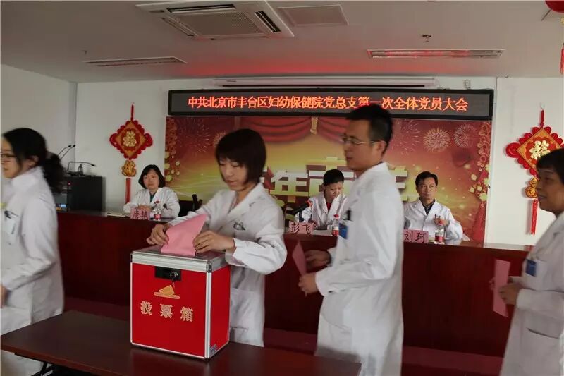 本次会议根据《中国共产党章程》、《中国共产党基层组织选举工作暂行条例》和《北京市基层党组织换届选举工作暂行条例》的相关规定,大会听取并审议通过了《中共北京市丰台区妇幼保健院党支部委员会工作报告》、审议通过了《党费收缴、使用和管理情况报告》、选举产生了中共北京市丰台区妇幼保健院党总支第一届委员会、顺利发展了2015年预备党员。根据大会选举办法和计票结果:彭飞同志当选第一届党总支委员会书记,王小年同志当选第一届党总支委员会副书记,刘珂同志、唐艳同志、刘姗同志当选第一届党总支委员会委员;根据票投结果:通过接收孙志娟、姜爽两名同志为中国共产党预备党员。
