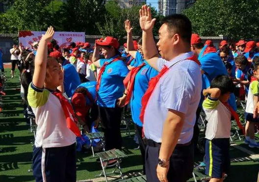 在简短的升旗仪式后,街道党工委书记赵长河为今天的“我和我的祖国——志愿童行”主题教育活动致辞。随后,来自右安门街道的志愿者们分别为一年级加入少先队的学生授红领巾。